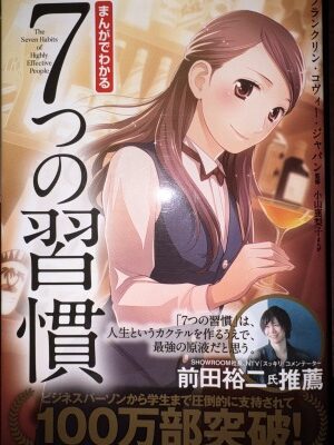 その本は「まんがでわかる 7つの習慣 / 宝島社」です。7つの習慣というと、自己啓発本の王さまとして今まで君臨しています。今でも読み返すと人生の本質がわかってくる本です。その本のまんがバージョン。飽きずに最後まで人生の本質について教えてくれますよ。